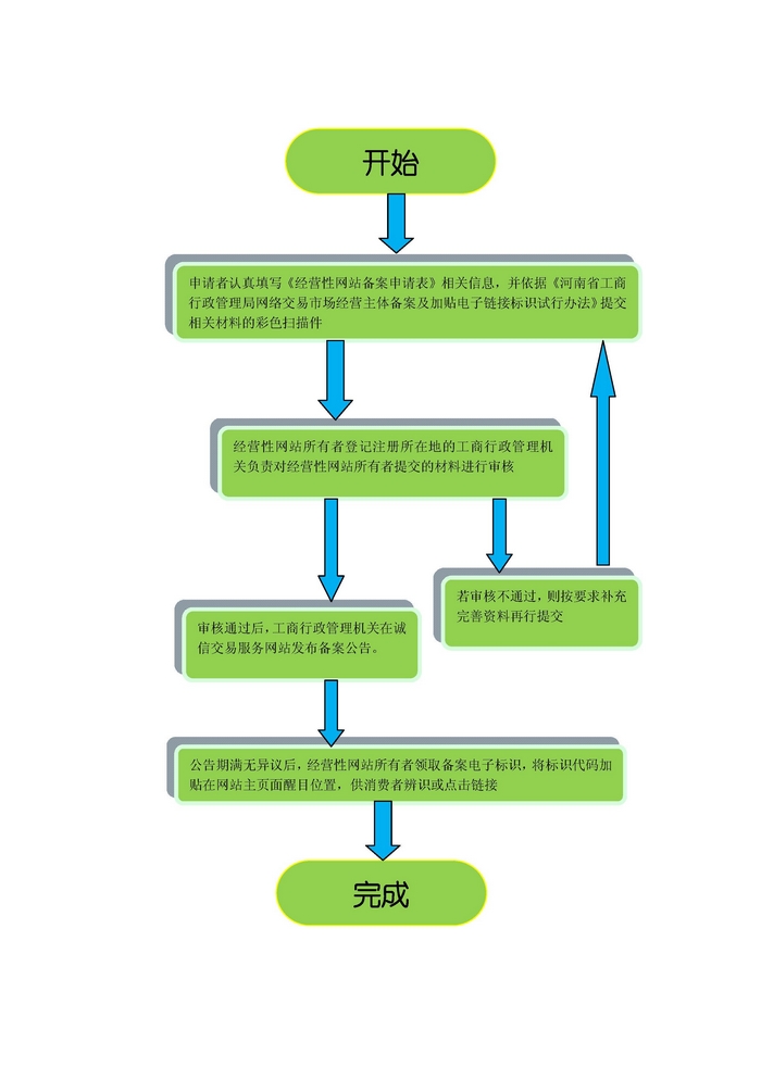 一、電子標識申請的基本流程 (一)經營性網站所有者通過訪問河南省工商行政管理局網絡誠信交易服務網站(http://wj.haaic.gov.cn),在線填寫《經營性網站備案申請表》相關信息,并依據《河南省工商行政管理局經營性網站備案及加貼電子鏈接標識試行辦法》提交相關材料的彩色掃描件(規格:圖片格式為jpg或bmp、色彩位數8-16位、掃描分辨率150-200 dpi。); (二)經營性網站所有者注冊登記地的省轄市或省直管試點縣(市)工商局負責對經營性網站所有者提交的材料進行審核。審核通過后,工商行政管理機關在誠信交易服務網站發布備案公告。在公告期滿且無異議后向該備案申請人發放經營性網站備案號和備案電子鏈接標識,建立相關鏈接頁面。 (三)經營性網站所有者按約定方法(數字證書密鑰或約定密碼)領取備案電子標識,會同網站設計單位將標識代碼加貼在網站主頁面醒目位置,供消費者辨識或點擊鏈接。 二、申請流程示意圖