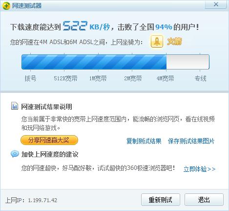 才4M的帶寬,360居然說(shuō)我的網(wǎng)速是“火箭”級(jí)的,真是頭暈。我的幾個(gè)朋友,他們用的都是10M的寬帶,比我的強(qiáng)多了。