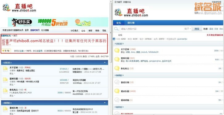 ![]() 左邊為真直播吧頁面,右邊為假直播吧頁面(刊登了許多非法賭球、網(wǎng)絡(luò)賭博等廣告) 除此之外,冒牌“直播吧”還借用原直播吧論壇域名bbs.zhibo8.com另立論壇,目前該論壇注冊會員數(shù)已經(jīng)超2萬人,原因在于這個冒牌論壇謊稱數(shù)據(jù)丟失,讓用戶重新注冊,可見仍有不少不知情的原直播吧(zhibo8.cc)會員誤入此網(wǎng)站。在此,筆者也提醒廣大用戶,目前直播吧的官方論壇域名為bbs.zhibo8.cc,論壇數(shù)據(jù)并沒有丟失,并且在論壇上有直播吧被盜的通告,望看到此篇報道的用戶相互轉(zhuǎn)告,讓那些進入冒牌論壇的用戶能夠“回家”。