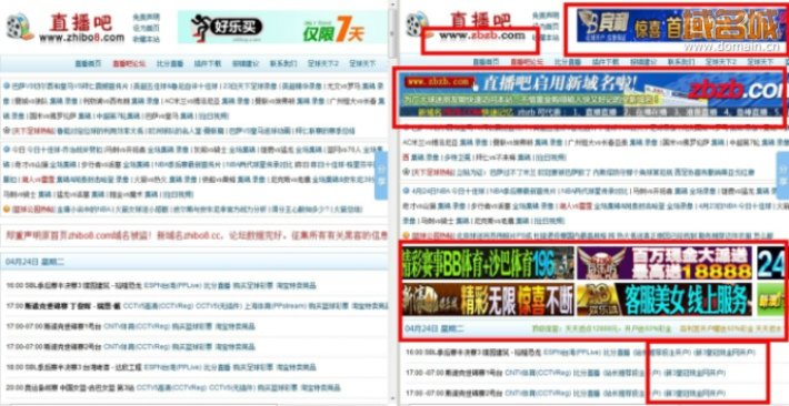 ![]() 被盜竊的直播吧發(fā)布的虛假公告頁面 筆者隨后聯(lián)系了直播吧(zhibo8.cc)的官方人員,官方人士稱,原域名zhibo8.com確實沒有追回,而盜竊該域名的非法人士也借用zhibo8.com該域名進行非法謀利、盜竊用戶信息等惡意手段。同時直播吧官方也提醒廣大用戶,目前直播吧的官方域名為zhibo8.cc,這也是當前直播吧官方網(wǎng)站的唯一入口。 鑒于此,筆者也做出了新舊直播吧的比較,其中真假非常容易區(qū)分,在假“直播吧”上,到處張貼著非法賭球、網(wǎng)絡(luò)賭博等廣告。而真的直播吧(zhibo8.cc)頁面上則沒有任何的廣告,屬正規(guī)合法站點。