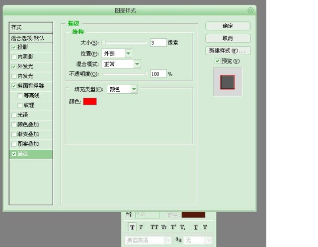 今天我選擇1、描邊,2、顏色:紅色,3、投影,4、外發光,5、斜面和浮雕,最后點擊確定。