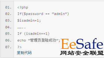 | 作為一個網站站長,尤其是新站站長,有時候為了修改網站的功能、添加網站的特色,就不得不自己寫一些代碼。在這個過程中,若出現一點錯誤,可能就會給網站帶災難性安全危機。即使網站原本是由專業開發團隊開發上線的,有較好的安全性,但是在木桶原理的作用下,你添加的那幾行錯誤代碼,完全可以導致整個網站的安全機制土崩瓦解。 現在將EeSafe網站安全聯盟列出幾點使用php架構的網站常出現的代碼級安全問題,希望對站長的修改代碼工作有一定的幫助。大家有什么疑問,可以到EeSafe網絡安全中心交流,EeSafe期待和大家共同進步 1.現在最常見的php代碼編寫上的安全問題 Php全局變量危害代碼: